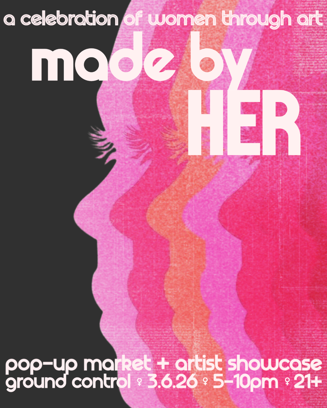 This event blends market + gallery + interactive installation, transforming Ground Control into a space that highlights and honors women from multiple angles.